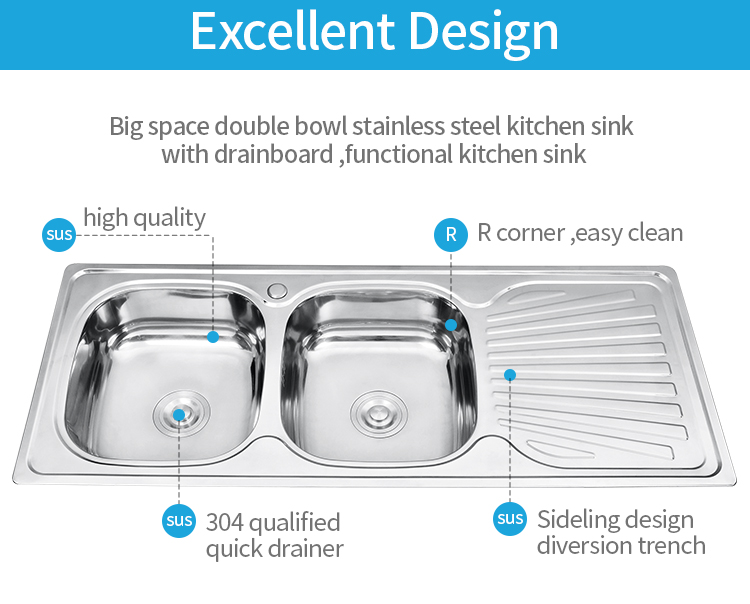 Величина 1200 * 500 мм, 48 * 20 инча, дубина и дебљина се могу прилагодити.Дизајн двоструке посуде са плочом за одвод.Сада је површина овог узорка мат завршна обрада која се зове "Пеарл Санд".Прихватамо прилагођене друге завршне обраде као што су полирање и брушено.Овај модел се може поставити на постоље као једноставна кухиња за породичну употребу или комерцијална кухиња.Да бисмо задовољили различите захтеве купаца, истражили смо 10 различитих дизајна за ову величину.